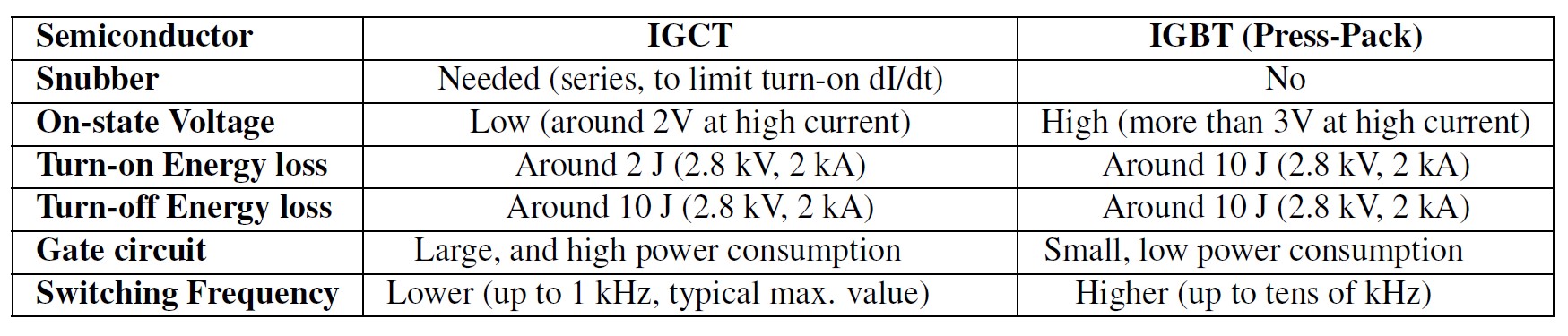 Because of their different operating principles, comparing IGBTs and IGCTs using datasheet ratings is difficult. In addition, IGBTs are available in a wider array of packages, resulting in a wider range of operating capabilities. By limiting the comparison to press pack devices, IGBTs and IGCTs can be compared using several factors such as the need for, or lack of need for, a snubber, their on-state voltages, turn-on and turn-off energy loss, gate circuit requirements, and switching frequencies (Table 1).