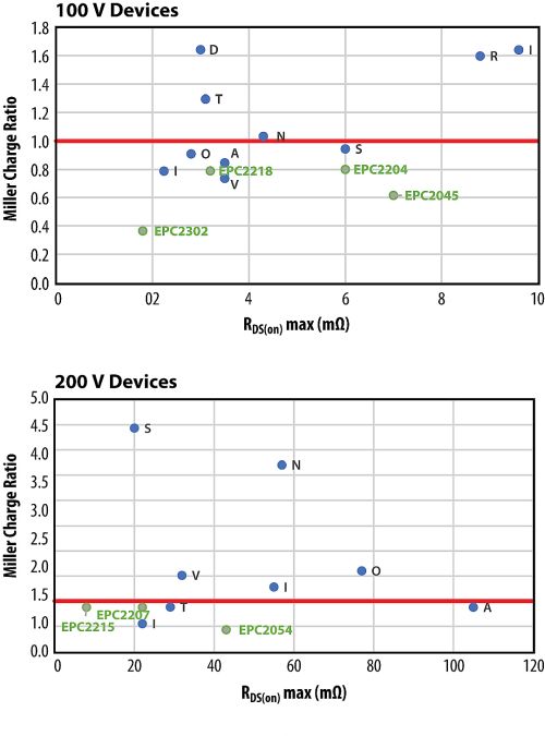 Miller charge ratios for EPC eGaN FETs are all below one. This means eGaN FETs are not susceptible to Miller shoot through! For comparison, many 100-V and 200-V-class silicon MOSFETs are quite susceptible to Miller shoot-through and care should be taken when using such devices.