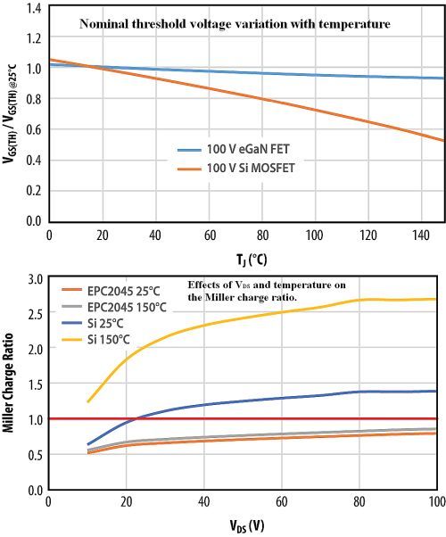 Another important consideration is threshold voltage variation with temperature. In silicon MOSFETs the threshold voltage falls with temperature. So when the device is at its operating temperature the QG(TH) can be as much as 50% lower than the datasheet value, which means a x2 factor on the Miller charge ratio. On the other hand, the variation for any eGaN FET is less than 10%.