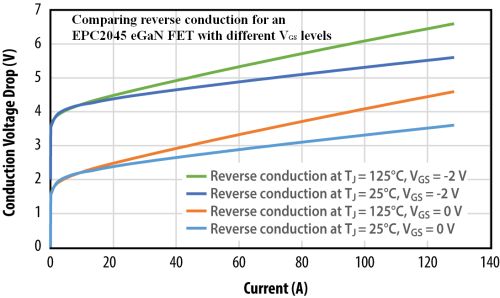 In contrast, a GaN FET has no such diode. This quality is an advantage because it means QRR is zero. However, GaN FETs do conduct current in the reverse direction in a way like a diode. This reverse conduction path is formed by turning on the 2DEG in the reverse direction, using the positive gate‐drain voltage to enhance the channel. Therefore, if the gate voltage drops below 0 V, the reverse conduction voltage will rise by the same amount. Thus it is important not to use negative gate drive as to not increase this voltage drop.