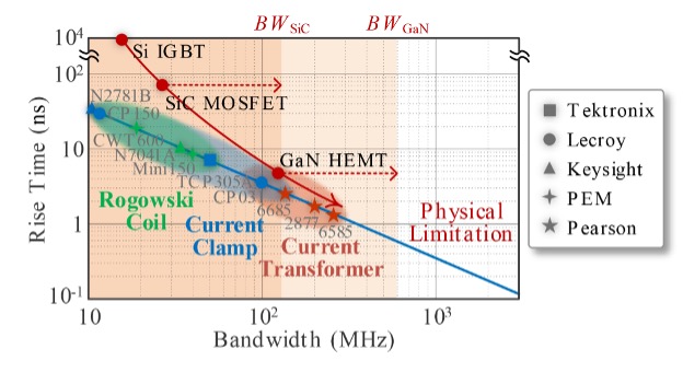 For example, Rogowski coils (RCs) are common in high-power applications since they can provide galvanic isolation, make high current measurements, and are simple to integrate. However, RCs’ bandwidth is limited to tens of MHz, and as discussed below, efforts are being made to design a new generation of RCs with bandwidths of 3 GHz and higher for use with WBGs.
