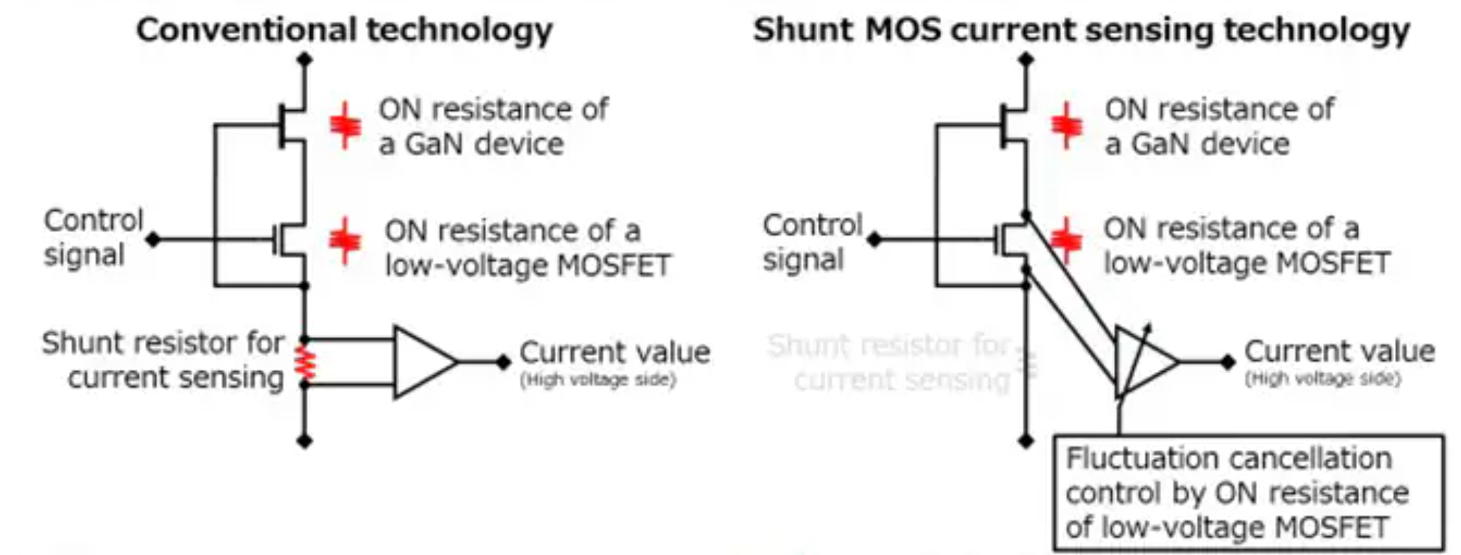 Different integrated current sensing approaches have been developed for enhancement-mode, e-mode, (usually off) GaN devices, and cascode devices combining a normally-on GaN HEMT and a normally-off Si MOSFET.