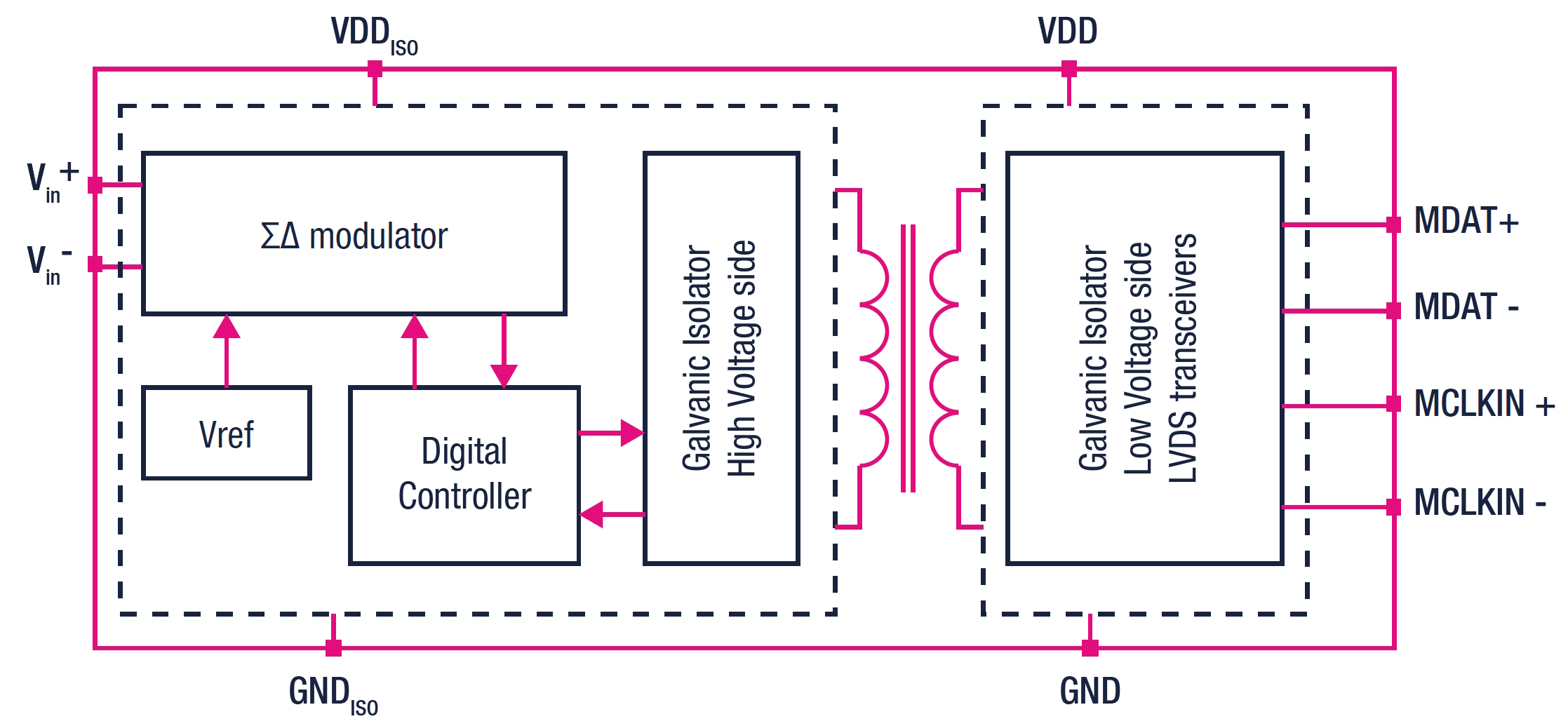 In EV DC charging stations, ΣΔ modulators are used to sense the input and output currents and voltages of the power factor controller (PFC) in the AC input stage and the DC/DC output stage connected to the battery pack. That requires a high accuracy ΣΔ modulator. Galvanic isolation can be used to eliminate stray currents that can cause data errors across the barrier. It also provides high levels of CMTI. The integrated solution has 6 kV SiO2 isolation technology and dual channels that can transfer data between an HV and LV domain at up to 100 Mbps with a pulse distortion below 3 ns (Figure 2).
