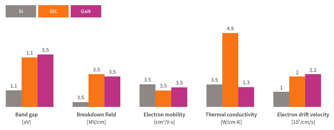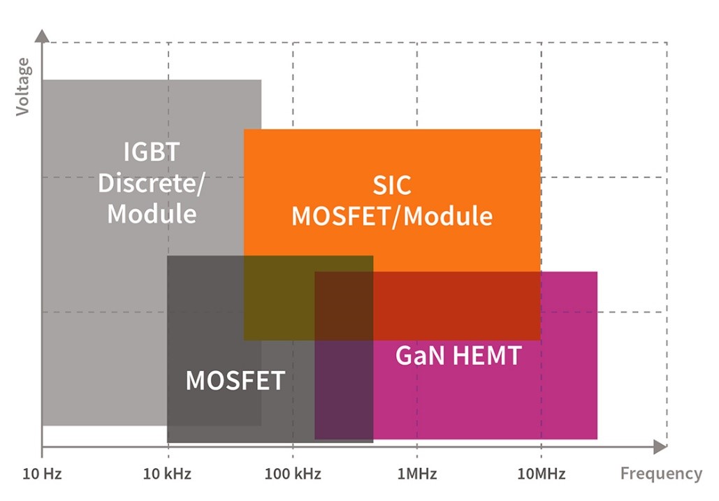 SiC MOSFETs extend the voltage and switching frequency beyond Si devices. While not as high voltages, GaN extends the frequencies into a considerably higher range. To address the extended operating ranges in Figure 1, Figure 2 compares the key parameters of SiC and GaN technologies to Si.