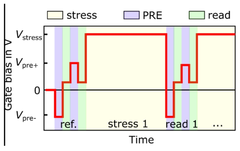 Infineon has proposed a positive BTI (PBTI) test sequence for more excellent repeatability, as shown in Figure 3. The preconditioning pulses more closely represent the gate switching in the application and reduce the influence of readout delays and device history. Since DC BTI in SiC can cause reliability concerns, it needs to be minimized by optimizing device processing and carefully assessing using appropriate measurement methods. This test facilitates that process.