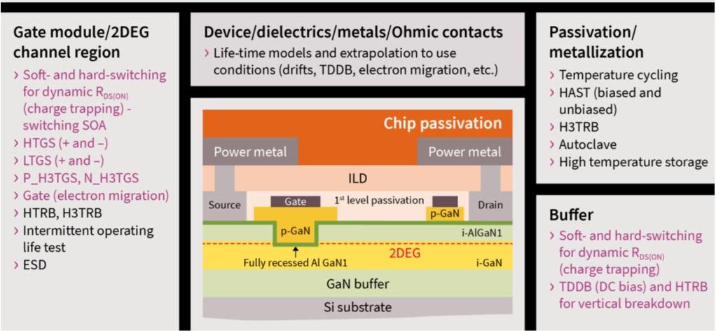 In GaN devices, the effect of dynamic RDS(ON) is caused by charges trapped during processing or due to the dynamic impacts that can interact with and modify the two-dimensional electron gas (2DEG) density in the channel, increasing RDS(ON). During development, it is important to ensure that the related increase in conduction losses is low during typical applications and that dynamic RDS(ON) does not fail. Figure 4 shows a summary of GaN-specific tests for aging and more. Passing these tests has qualified GaN devices and minimized aging effects.