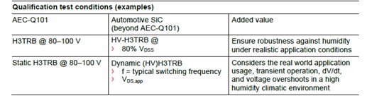 Other mandatory qualification tests for the release of any technology include High-Temperature Reverse Bias (HTRB), High Humidity, High Temperature and High Voltage Reverse Bias test (H3TRB), and High-Temperature Gate Stress (HTGS) tests. For a standard H3TRB qualification, T = 85°C, the relative humidity (rH) = 85% and VDS = 80V. However, with operation at much higher voltages, HV-H3TRB with VDS = 80% VDSS is a more appropriate measure to test the reliability of a SiC device against humidity. Table 1 shows this and other modified test conditions for automotive qualification at Infineon.