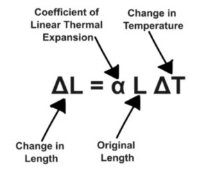 The coefficients of linear thermal expansion (CTE) of the two metals measure how the metals respond to changes in temperature. They are fundamental to bimetallic thermal control device design and performance (Equation 1). For an increase in temperature, the strip will bend towards the metal with the lower CTE; for a decrease in temperature, the strip will bend towards the metal with the higher CTE. In addition, material selection will determine the amount of bending and the sensitivity of the bimetallic strip.