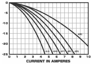 The derating curves illustrated above are for a snap-action thermal protection device designed for motor, transformer, and lighting applications that operate from 120, 240, and 277 Vac. The bimetallic element conducts the load current to ensure maximum sensitivity under short-circuit conditions in the load. Six bimetal variations are available from the low-sensitivity model J(B) to the maximum-sensitivity model J(J). The standard temperature differential between opening and closing can vary from 10 °C to 70 °C depending upon the no-load calibration temperature.
