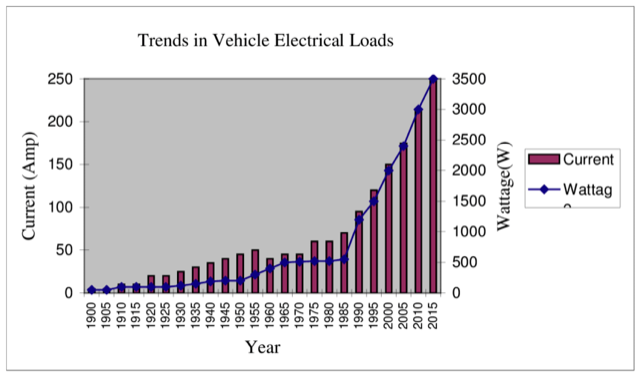 Nonetheless, loads increased beyond what the 6-V battery could support. The industry switched to 12-V batteries to provide more available energy, reduce losses, and allow the use of thinner cables carrying higher voltages but at lower amperage (Figure 2).
