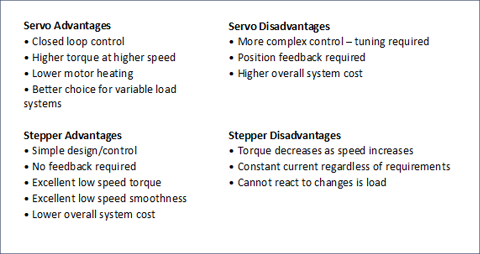A: Each has a mix of attributes, and the right choice depends on the application. Keep in mind that a stepper is generally used in an open-loop system, while a servo is a closed-loop system (Figure 2).