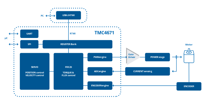 A much more sophisticated approach is offered by the Trinamic TMC4671 (Trinamic was purchased by Maxim Integrated, which in turn has become part of Analog Devices) (Figure 6). This IC is a fully integrated servo controller, providing field-oriented control (FOC) for BLDC/PMSM and 2-phase stepper motors, as well as DC motors and voice coils.