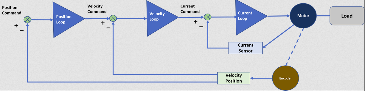 The amplifier compares the signal generated from the current position of the motor generated by the rotational-position encoder as feedback to the desired position of the motor. The amplifier error signal then drives the motor to reduce the error.