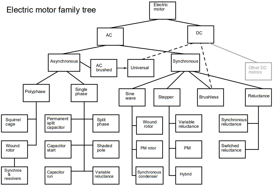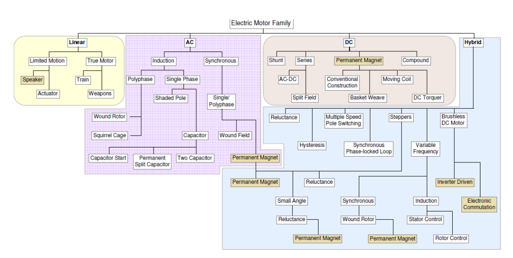 There are multiple reasons for this complexity. The motor world consists of almost countless groups, variants, and sub-variants within the two basic AC- and DC-supply groupings. There is no “perfect” or even very good moto- family tree or genealogy, as each one is created with the legitimate perspectives and biases of their source or author, as demonstrated by Figures 1, 2, and 3. One thing is certain: each motor type or group has different attributes, offers different performance characteristics, and will require different controller specifics.
