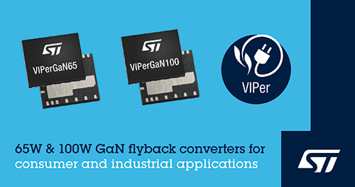 STMicroelectronics extended its high-voltage wide-bandgap power converter family by adding the VIPerGaN100 and VIPerGaN65 for single-switch quasi-resonant (QR) flyback converters up to 100W and 65W. Each operates in quasi-resonant mode, with dynamic blanking time and valley synchronization to reduce switching losses and maximize efficiency at all input line and load conditions. This assists in reducing energy usage, helping to meet ecodesign codes targeting global energy savings and net-zero carbon emissions. Integrated features to ensure safety and reliability include input voltage feedforward compensation to minimize peak power variation, output overvoltage protection, current sensing, input overvoltage protection, and brown-in and brown-out protection. Thermal shutdown is also included, as well as frequency jittering to suppress EMI.