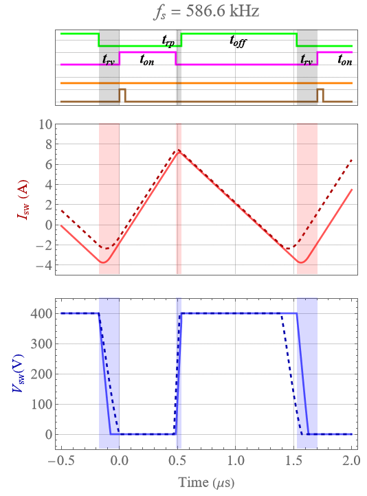 Figure 6 shows the operating waveforms when the applied frequency is too low (left), ideal (center), and too high (right). You can see that both ZVD signals are present only when the applied frequency is at the ideal value; thus, varying the frequency until ZVD is achieved for both FETs will reveal the ideal operating point.