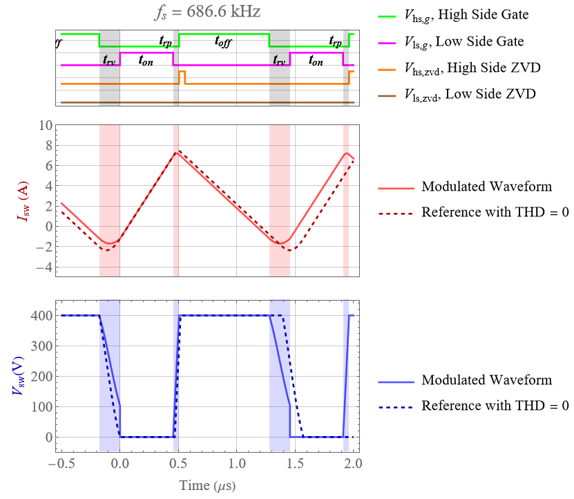 To achieve ZVS on every switching cycle — and simultaneously achieve low THD — the design uses a zero-voltage detection (ZVD) signal produced by the GaN switches [5]. This ZVD signal reports to the controller if the switches turn on with or without ZVS. With this information and the solution to the state plane for the FET resonant transitions, you can solve for the ideal timing to achieve ZVS on every switching cycle while also having an excellent power factor. Figure 5 illustrates this control.
