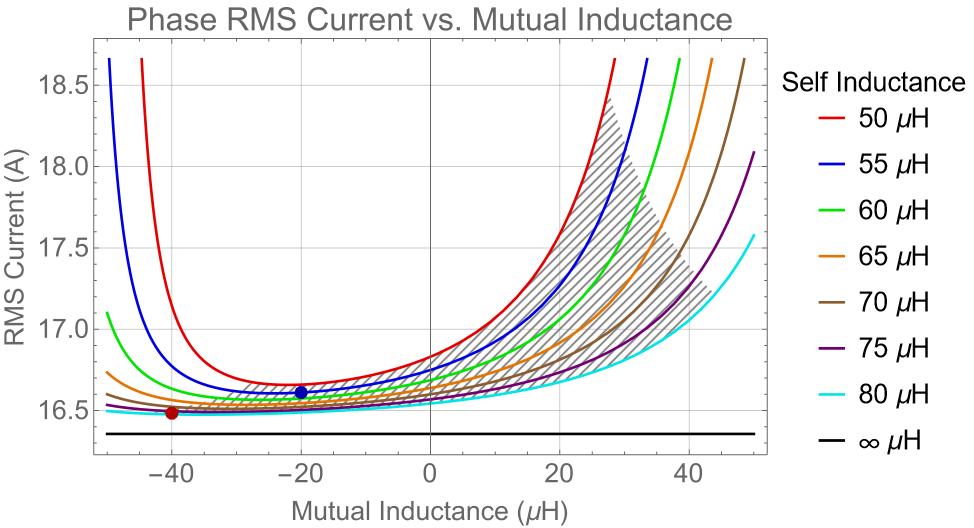 Figure 3 plots the RMS current in the winding as a function of the self-inductance (L1 and L2) and the mutual inductance (M). Notice that a minimum in the RMS current occurs when the mutual inductance is approximately –20µH. The dark blue dot denotes the ideal design point. This combination of self-inductance and mutual inductance yields a minimum RMS current with relatively small inductance values. I derived the hatched area in Figure 3 from surveying practical, cost-effective designs from magnetics manufacturers. It turns out that, in practice, it’s not cost-effective to achieve a coupled inductor in this region. As a result, I shifted the design to select the inductances corresponding to the red dot. This design point still captures the RMS current benefits from using a coupled inductor without using large inductance values.