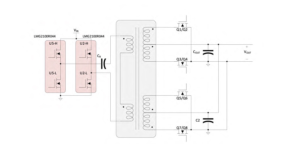 The final design example is a transformer in a high-density, 1 MHz, 1 kW one-eighth-brick inductor-inductor-capacitor (LLC) converter with an efficiency of over 98%. Like the first two examples, this design also uses GaN to achieve fast turn-on and turnoff times with low Coss [7]. An integrated PCB-based transformer eliminates the interconnect losses and reduces the size by wrapping the core around the PCB. Figure 8 is a schematic of the power stage and transformer structure.