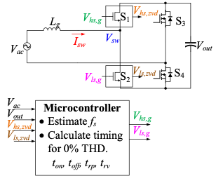 The two-phase, 5kW transition mode PFC for a server [4] operates with variable frequency to achieve zero voltage switching (ZVS) and a high-power factor at all operating points. To achieve this while keeping the overall size small, the operating frequency of the two phases varies between 70 kHz and 1.2 MHz. GaN is necessary to support the high switching frequencies [5]; however, you also need the advanced control techniques described in [6] to achieve ZVS and low total harmonic distortion (THD).