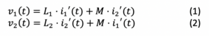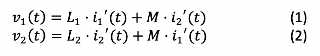 The coupled inductor used in the PFC works by using a single magnetic core for both windings. Equations 1 and 2 show the governing relationships between the winding voltages, currents, and inductances. In this design, L1 always equals L2.
