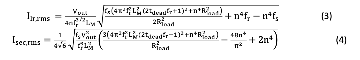 Most losses in the converter come from the RMS currents, thus requiring an accurate method to estimate the RMS currents in the transformer windings. The method presented in reference [10] does this by assuming that the magnetizing current stays constant when the converter operates at a switching frequency slightly below that of the resonant tank. With this assumption, creating a piecewise linear approximation of the LLC converter waveforms is possible. From these piecewise linear definitions of the current, you can derive the closed-form expressions of the RMS current for the transformer primary current and transformer secondary current, as shown in Equations 3 and 4: