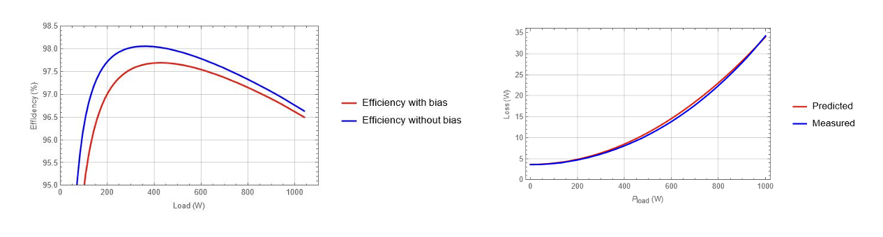 Figure 11 illustrates the measured losses and efficiency from the hardware. I collected this data with a 48V input constant-current load and forced air. Figure 11 also shows the module efficiency and compares the predicted and measured losses.
