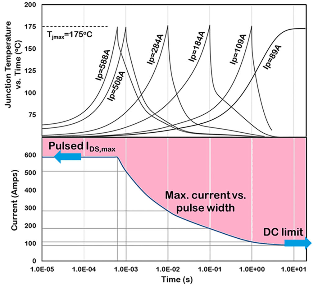 Practical implications for the sample SiC FET device are depicted in Figure 2 and Figure 3. In each scenario, the device case is soldered to a copper plane on a PCB with copper thermal vias through to a back-side aluminum heatsink held at 50 °C, separated by an insulating thermal interface material (TIM). Figure 2 illustrates that a thermal resistance of >1.2oC/W from junction to ambient may be expected, while the die and TOLL package determine the transient thermal response below approximately 1 ms. As depicted in Figure 3, with this arrangement, the continuous rating is 89 A, while the device can handle up to 588 A peak current for a 500 µs single pulse before reaching TJ,Max of 175 °C.