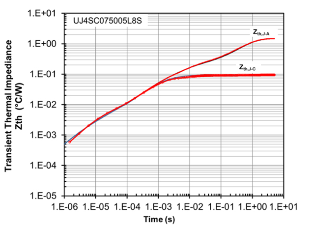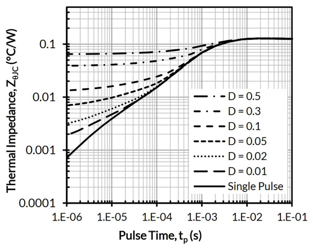 The maximum junction temperature (TJ,Max) figure for a SiC device and its current rating are essentially dictated by the packaging used. Despite the intrinsic material capability of SiC to operate safely at temperatures exceeding 500 °C, the maximum is limited to 175 °C in the JFET of a cascode SiC FET. This restriction still allows SiC FETs to handle transient peak currents significantly higher than their continuous rating when initiated from lower temperatures. The transient thermal impedance plot for a specific die and package, such as the aforementioned SiC FET device, outlines these characteristics, as shown in Figure 1.