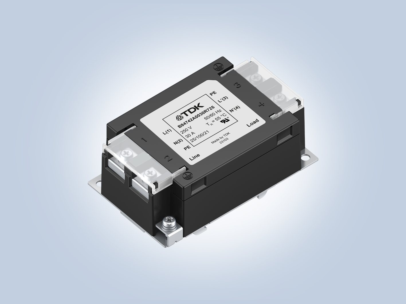 TDK Corporation has expanded its portfolio of single-phase EMC filters with the B84742A*R725 series. These components serve AC as well as DC applications up to 250 V and rated currents from 6 A to 30 A. This means they can be used for increasingly popular DC infrastructure in the industrial and building sectors. Available in five versions, the 97 x 60 x 34.5 mm (L x W x H) small single-phase filters, weighing no more than 310 g, can be snapped quickly and conveniently onto the TH35 DIN rail, also known as a top-hat rail. The conductors are fastened with M4 screws, and the screw connection is equipped with touch protection.