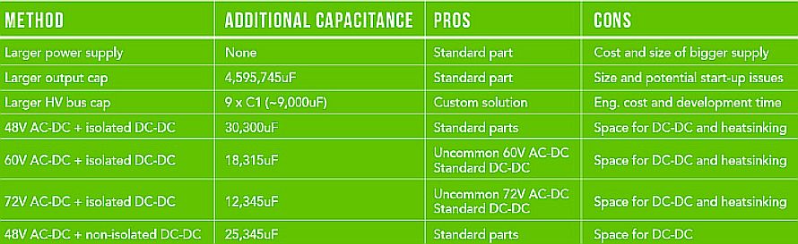 If the 48-V ac-dc supply was replaced by one having a 60-V output, the additional capacitance could be reduced to 18,315 uF. A 72-V output power supply would further reduce that to 12,345 uF.