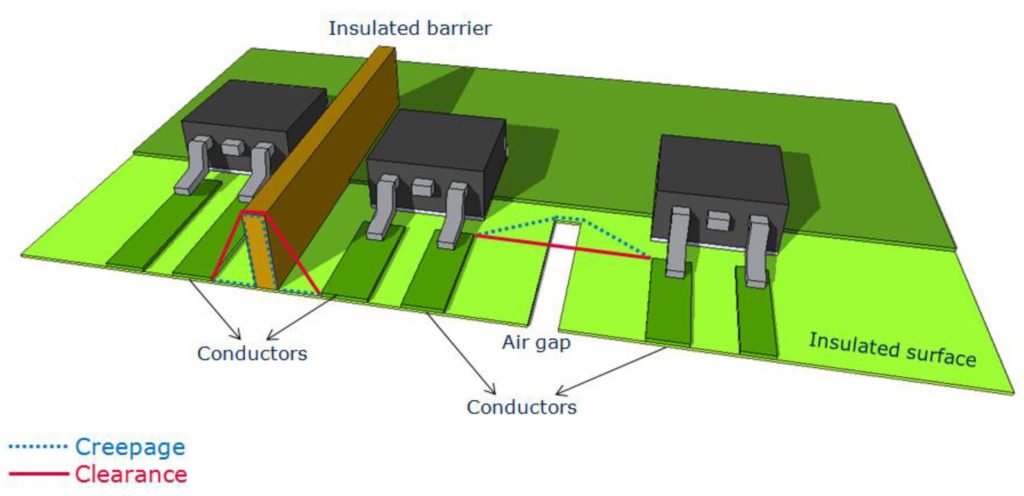 Creepage distance is intended to prevent the development of a conductive path along the surface of an isolator due to a high voltage applied over time. It’s related to the RMS value and depends on environmental conditions, described by the isolator’s material characteristics and the pollution degree. IEC 60335-1 requires 8.0 mm of creepage for reinforced insulation when the working voltage is between 250 and 300 volts, while IEC 60950-1 specifies only 6.4 mm creepage. When the working voltage is between 200 and 250 V, both standards call for 5 mm of creepage.