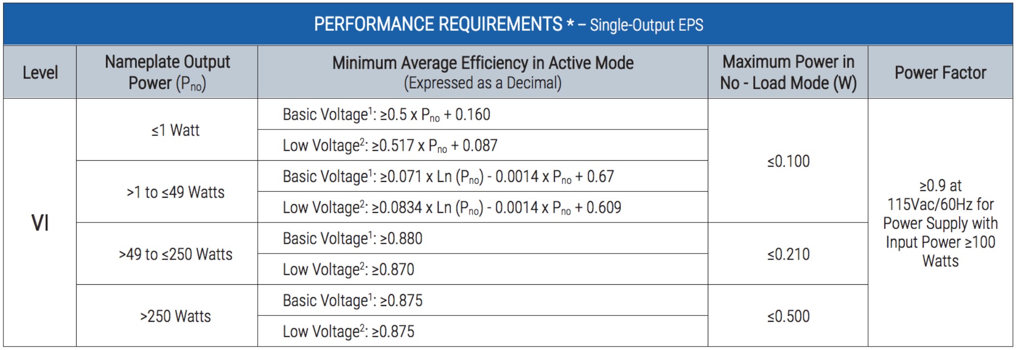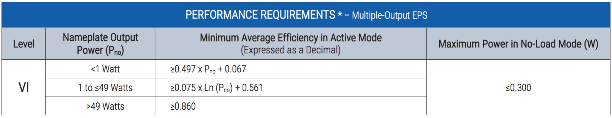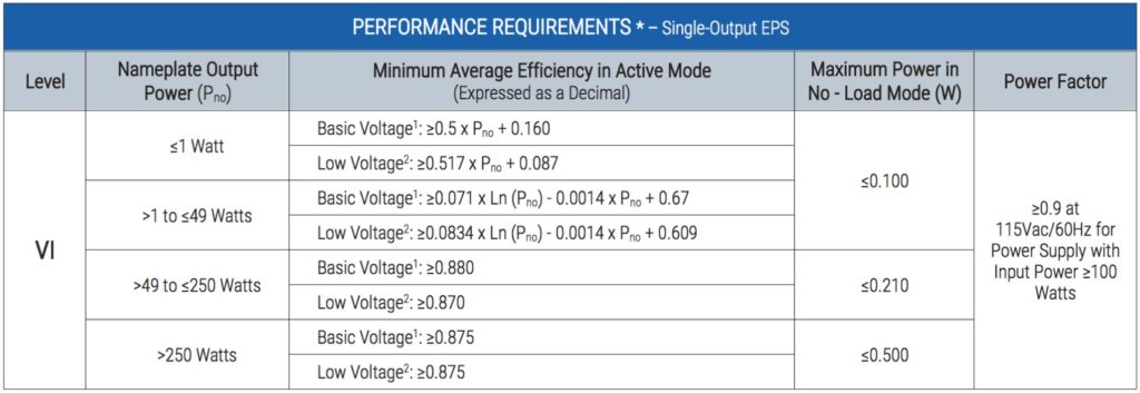 The US is currently at DoE Level VI, which is a mandatory regulation (Tables 1 & 2), and Canada has harmonized with the US’s Level VI performance requirements. The EU uses Commission Regulation (EU) 2019/1782 or Ecodesign 2019/1782 is generally harmonized with Level VI but requires additional documentation and reporting. The EU Code of Conduct (CoC) Tier 2, if it becomes adopted, is even more restrictive on power supply efficiency.