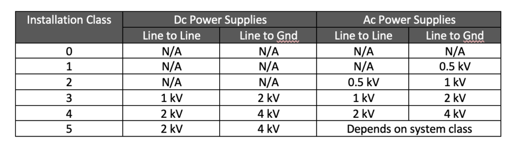 IEC 61000-4-5 defines a standardized test method and different levels of protection based on installation class and coupling methods (Table 1). Installation classes 3-5, which have test requirements ranging from 1kV to 4kV, are of the most relevance for DC power supply.