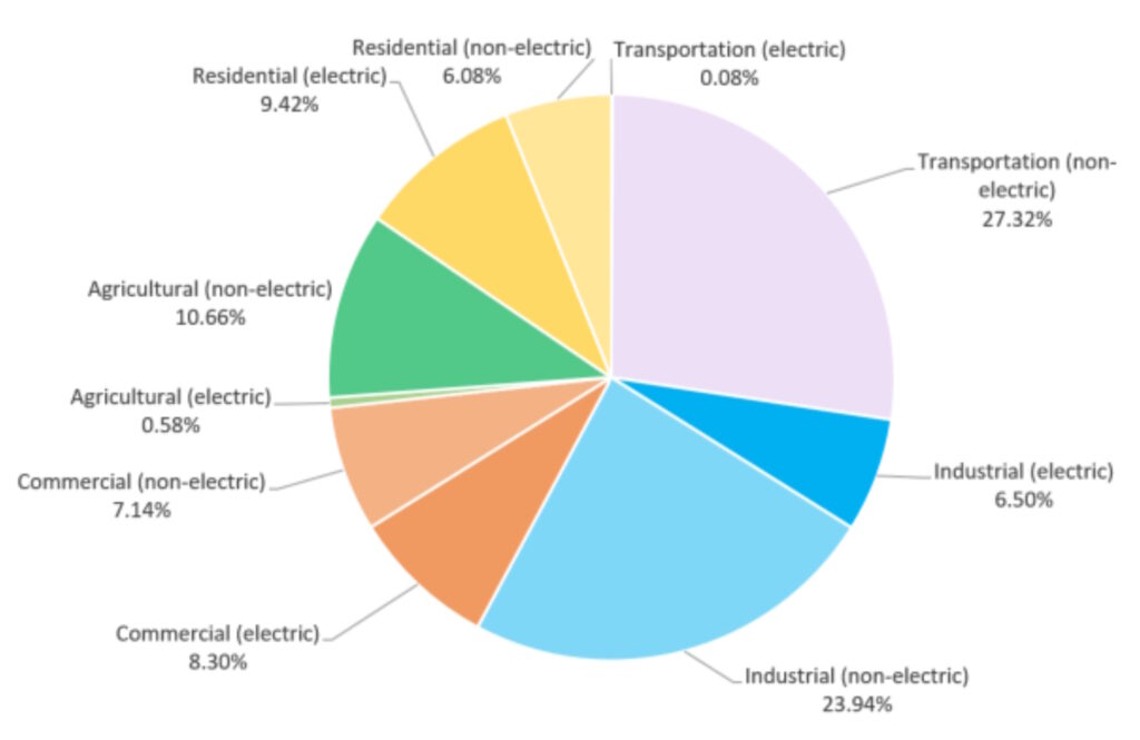 Electrification is in the early stages of deployment. Today, non-electric emissions dominate in most segments (Figure 1). This FAQ provides a broad and deep review of how AI and ML can support decarbonization. It begins with a layered view of how AI and digitization will be implemented across the utility grid, then reviews how AI will enable the use of phasor measurement units (PMUs) that support efficient integration of renewable energy into the transmission grid and closes with a glance of how ML is being used to unwrap and filter the data from PMUs into actionable information.