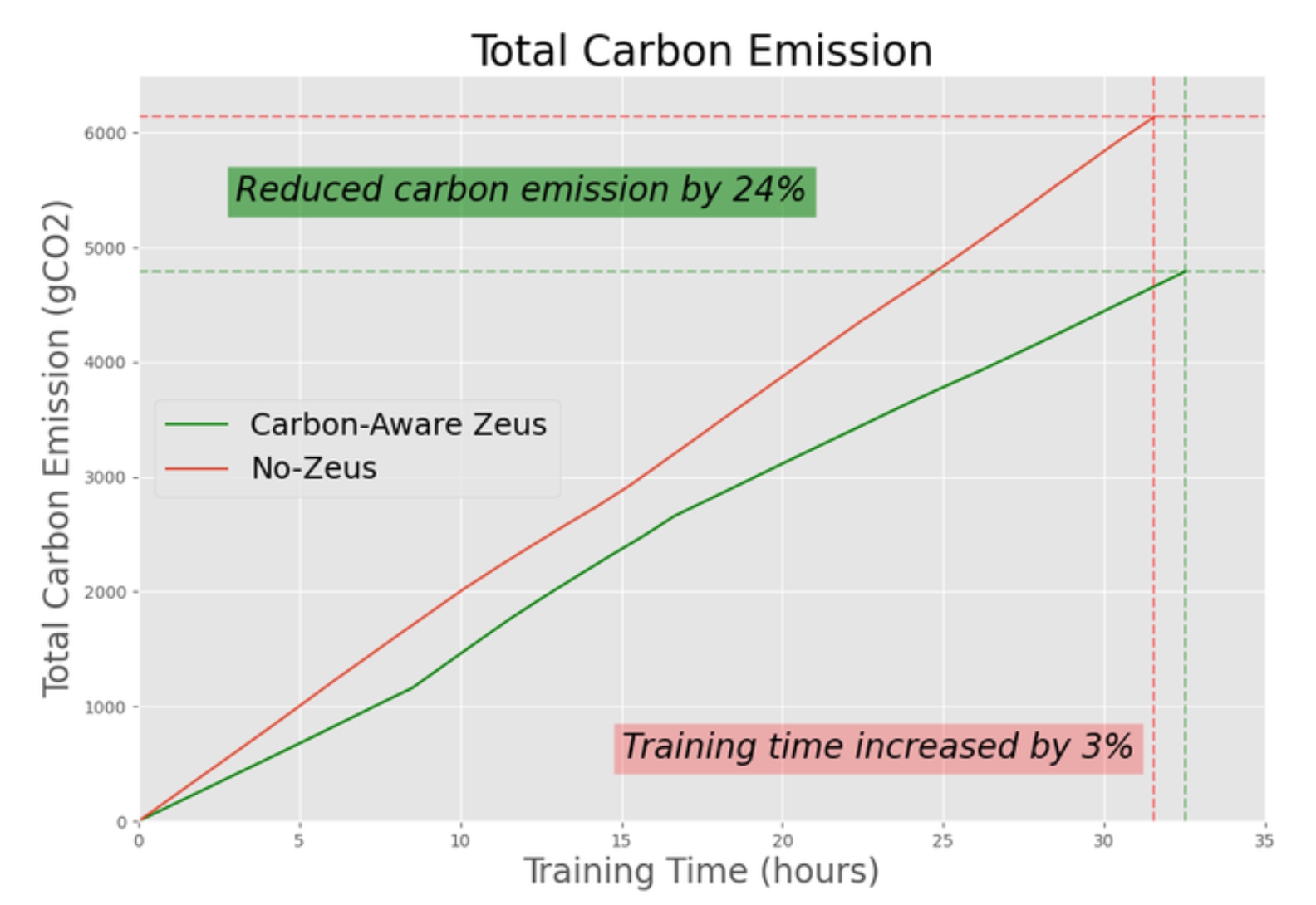 While basic power capping can result in about a 15% energy savings, carbon-aware power capping can reduce the overall carbon footprint of training by about 24% and still only increase the training time by about 3% (Figure 2).