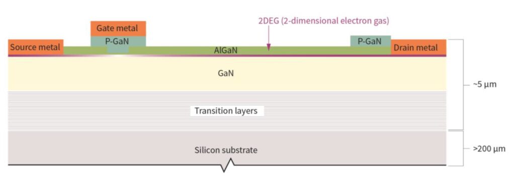 It’s not just the structure; device physics are different for GaN and Si. In a GaN HEMT, a thin high-density layer of electrons called a 2-dimensional gas (2DEG) forms between the GaN and AlGaN layers (Figure 1). When an enhancement-mode GaN HEMT is unbiased (OFF), the 2DEG layer is broken beneath the gate, preventing current flow. A sufficiently high positive gate to source voltage generates a vertical field beneath the gate, reforming the 2DEG, completing the circuit between the drain and source, and turning the device ON.