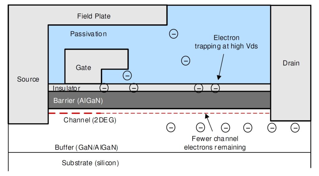 In a GaN HEMT, trapped electrons repel the electrons in the 2DEG channel, reducing the available electrons in the channel and increasing on resistance (RON) (Figure 2). Electrons can be trapped in the dielectrics, buffer layers, and interfaces. Trapping is caused by high drain voltages when the device is off or by hot electrons when the device is switching. The combined effect of the device’s normal RON plus the RON increase caused by charge trapping is called dynamic RON. It’s called dynamic since RON can recover as the trapped charge ‘detraps’ or dissipates. If the detrapping rate is low, there could be a greater impact from dynamic RON. Time scales similar to the switching time of the converter need to be used to evaluate the impact of dynamic RON.