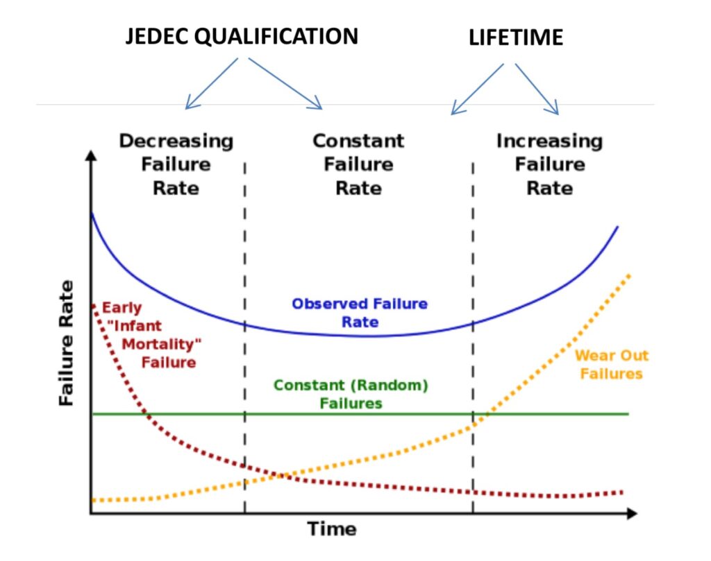 The ‘bathtub curve’ represents the three phases in a product’s reliability. It starts with an infant mortality or early life failure (ELF) phase with relatively large numbers of failures with a decreasing frequency (Figure 4). Understanding the ELF phase is particularly important when designing burn-in processes to weed out the infant mortality and drive the remaining population to the bottom of the curve. ELF testing is also used in identifying important device failure mechanisms. JEDEC JESD47K includes early life failure (ELF) testing. The previously discussed JEDEC and AEC testing are more related to the flat bottom portion of the curve.