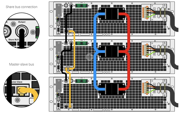 For that, makers have incorporated a technique called Master-Auxiliary with a dedicated load-share bus. In this mode, when multiple power supply models of the same series are connected via the Master-Auxiliary bus and Share bus, the entire multi-device system behaves as a single device. With the Master-Auxiliary bus, system data such as total power and total current are collected and shown on the Master device. Warnings and alarms for the auxiliary devices are shown clearly on the display. The Share bus provides an equal load distribution to the individual device.