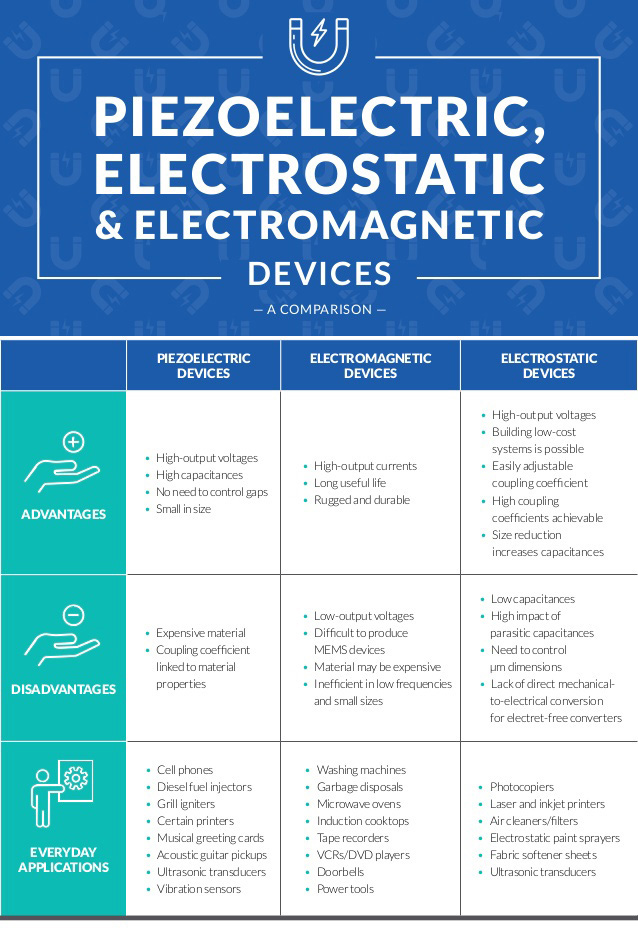 When it comes to electronic design, function dictates framework. While piezoelectric, electrostatic, and electromagnetic devices offer distinct benefits, each comes with specific drawbacks and best-fit applications.