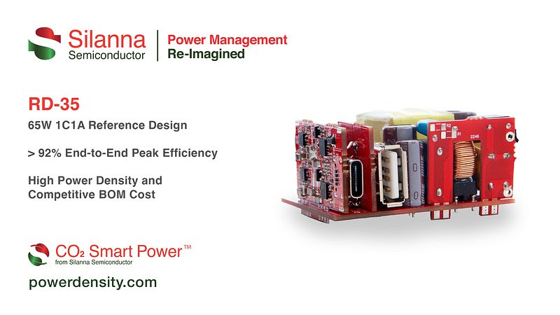 The RD-35 is the latest addition to Silanna’s comprehensive family of production-ready reference designs that provide everything needed to develop high-density chargers with low operational and no-load/standby power consumption and minimum component count, BOM cost, and size. This family includes all-silicon 33W and 45W solutions and silicon- and GaN-based single- and multiple-output 65W and 100W USB-PD reference designs.